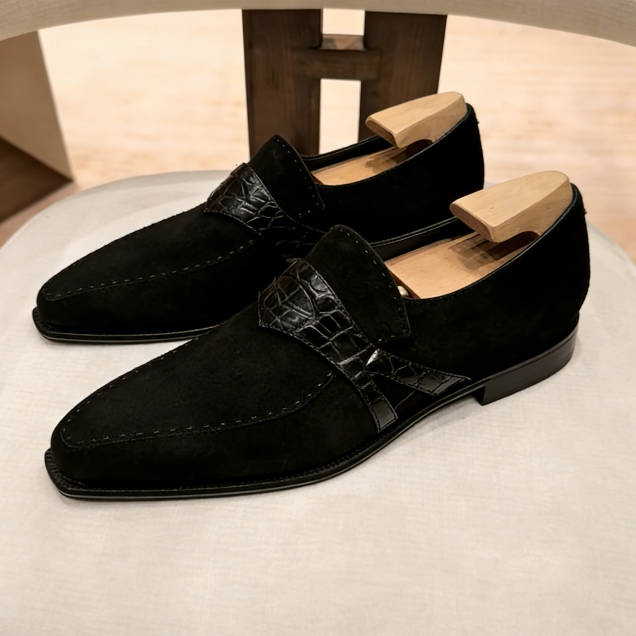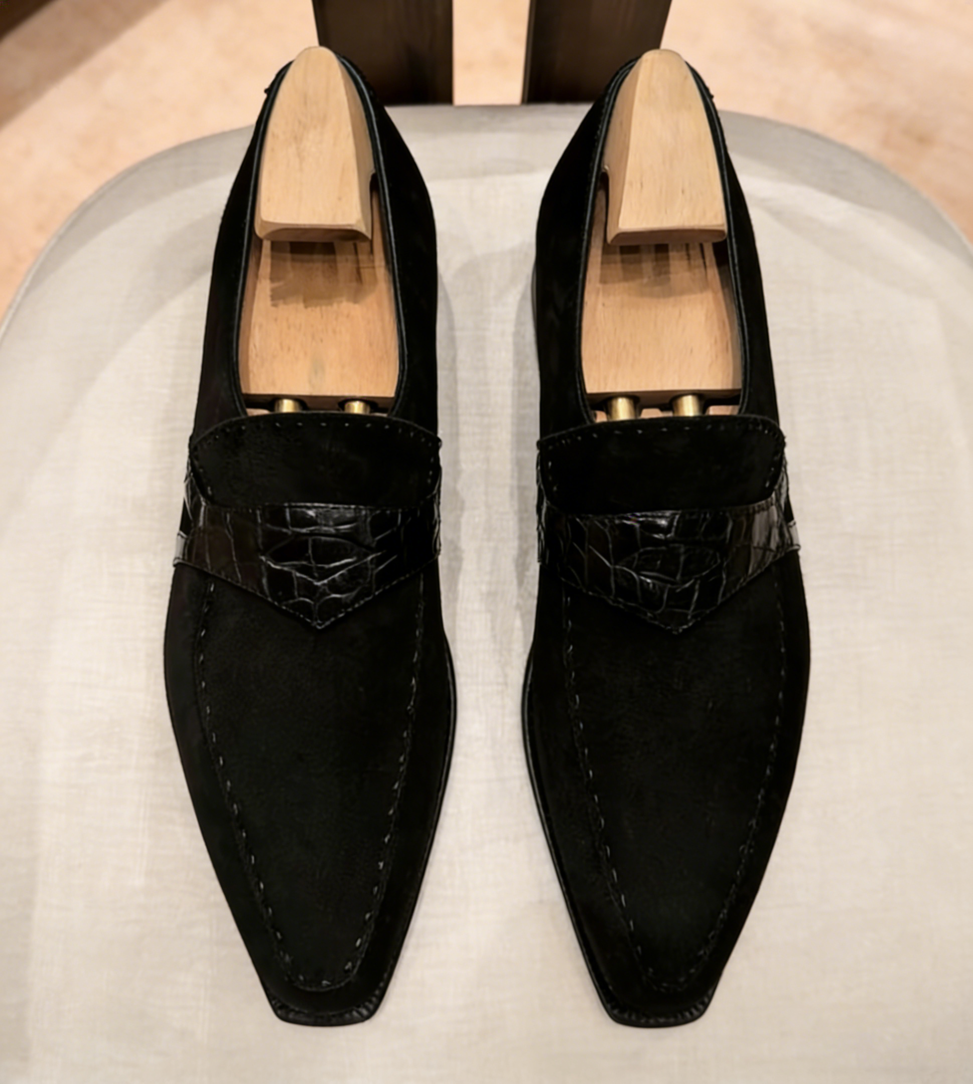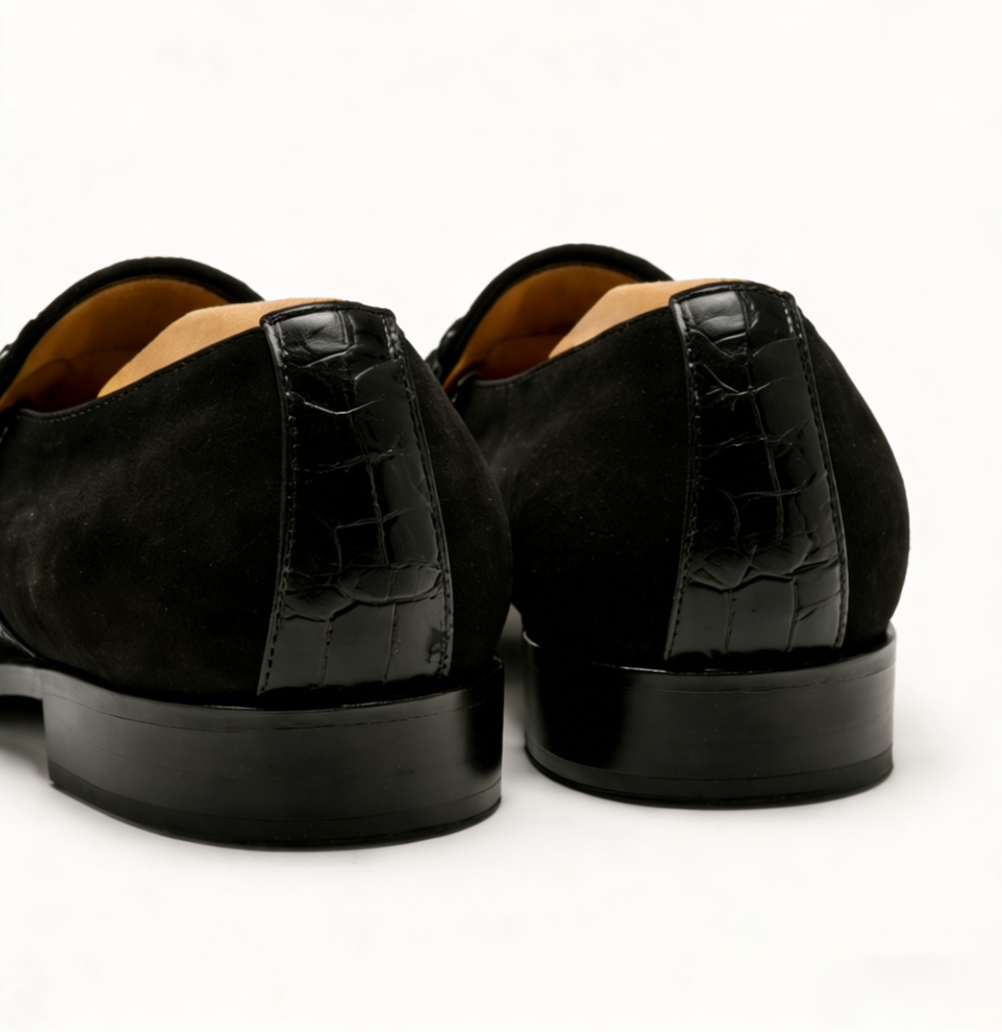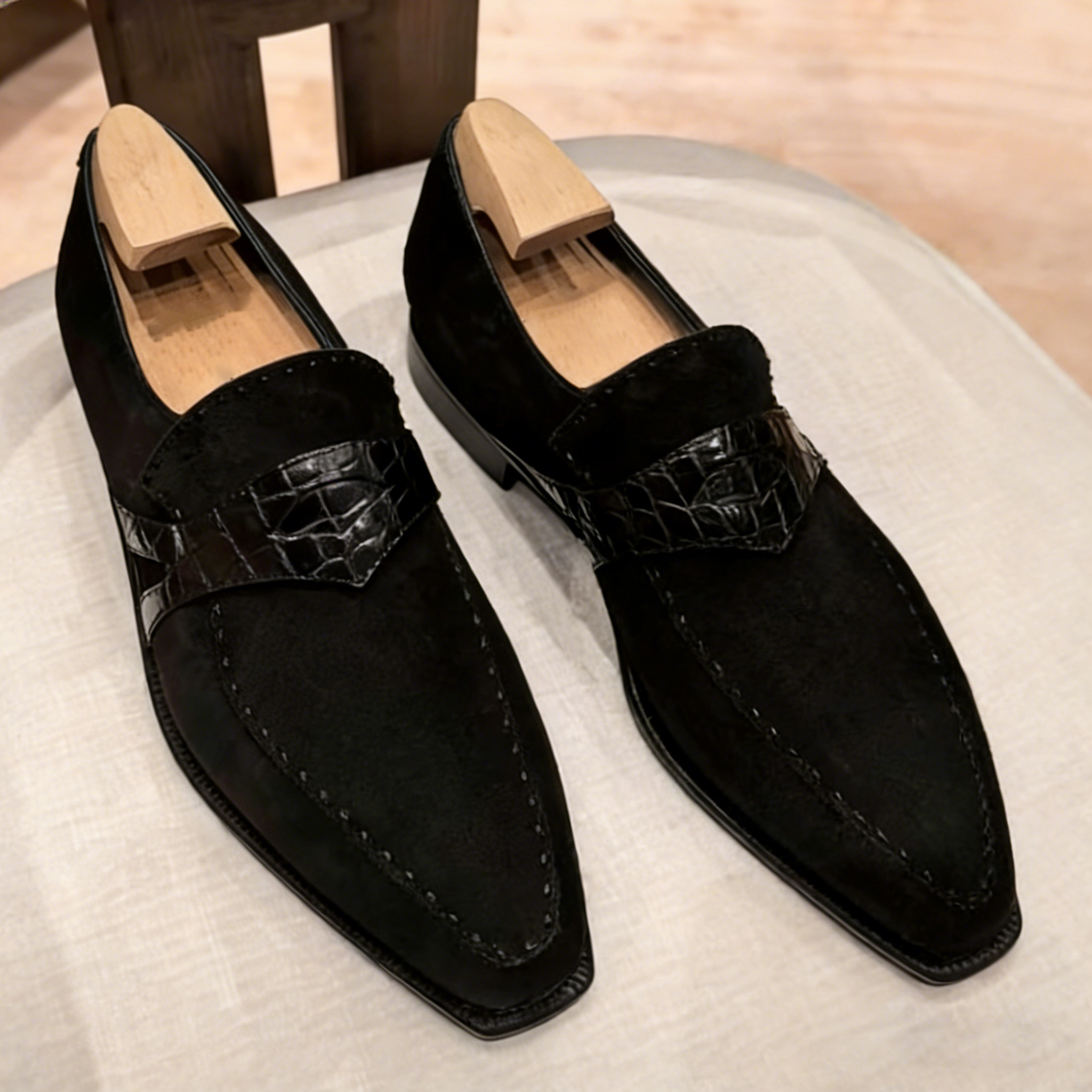 Premium Suede & Crocodile Embossed Leather – Soft black suede upper paired with a glossy crocodile-embossed leather strap, blending casual luxury with bold, sophisticated texture.