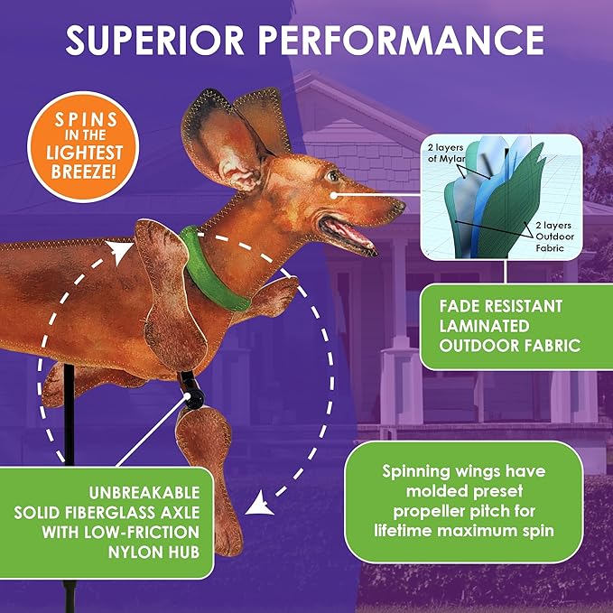 VIBRANT COLORFUL DESIGN – Featuring a charming Dachshund motif with detailed patterns & vibrant colors, this spinner adds playful personality to patios or gardens. Perfect for dog lovers, it brings lively motion & personality to any outdoor space.
